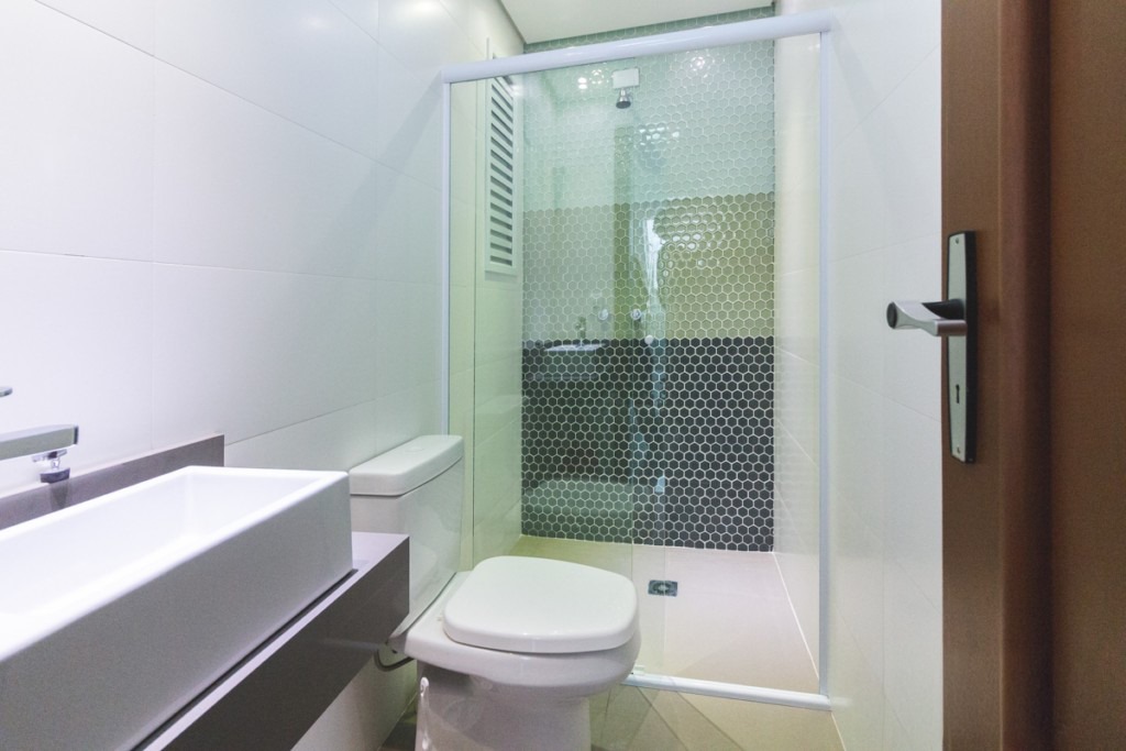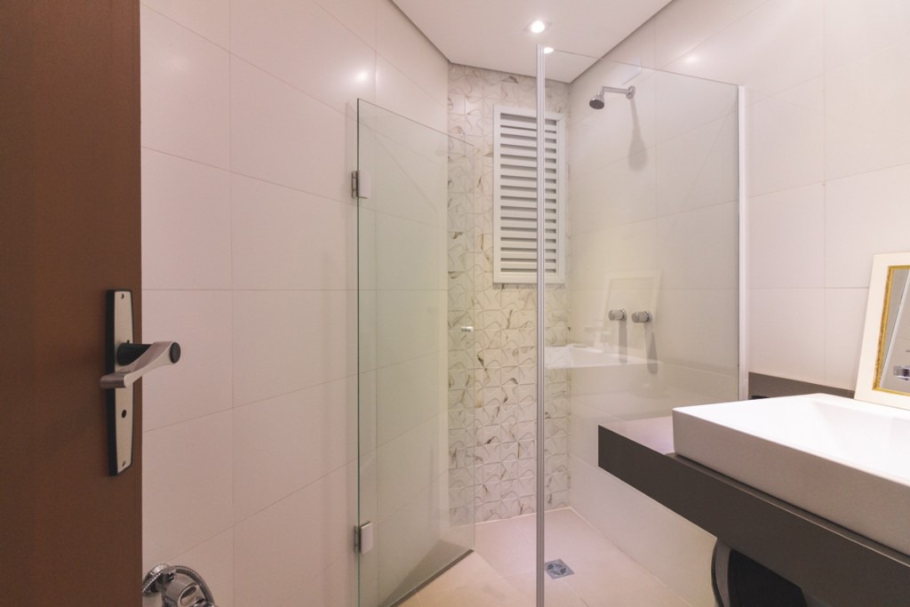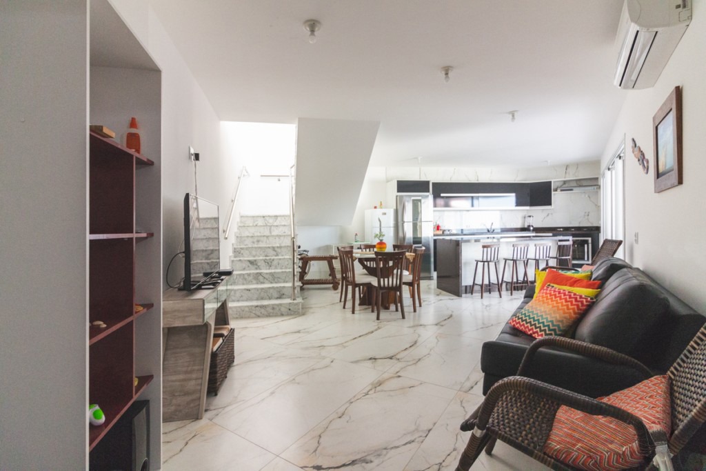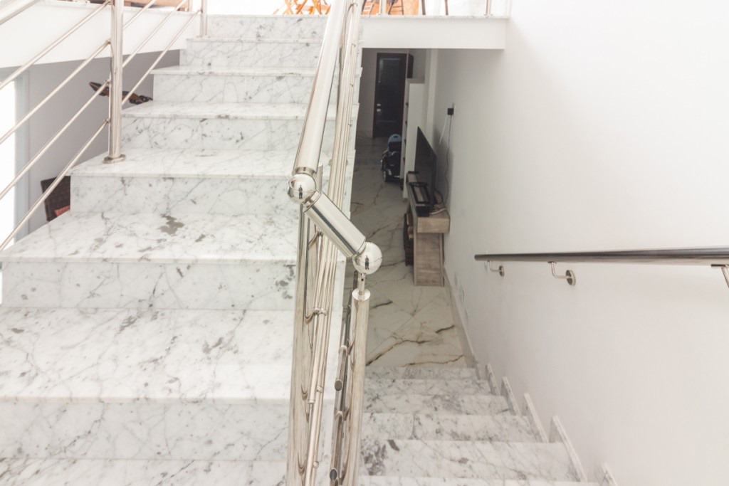 A escada interna possui corrimão em inox, trazendo um toque de requinte ao acesso entre os pavimentos. No pavimento superior, o destaque fica para o terraço com piscina em porcelanato contratando com mármore.